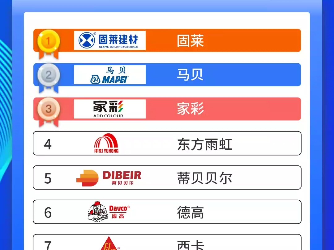 4、1京固瓷砖背胶十大瓷砖背胶品牌,中国著名品牌,中国百强优秀企业,防水涂料十大品牌2德高DAVCO瓷砖背胶十大瓷砖胶品牌,国内特种干砂浆行业领导者之一,全球最主要的建筑砂浆企业法国PAREX旗下集团3雨虹YUHONG瓷砖背胶中国驰名商标,北京名牌产品,十大瓷砖胶品牌,北京市著名商标,北京雨虹防水技术。